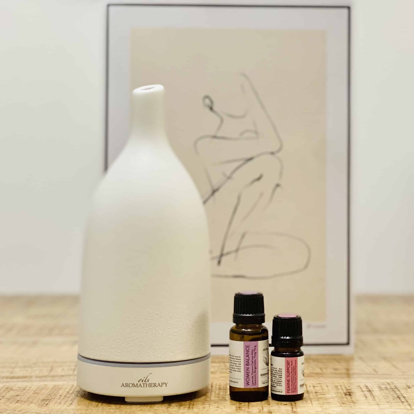 Ceramiczny, ultradźwiękowy dyfuzor do olejków eterycznych AromatherapyOils w białym kolorze. Dwie mieszanki olejków eterycznych, stworzone specjalnie dla kobiet: Women Balance o pojemności 15ml oraz Femine Support o pojemności 5ml.